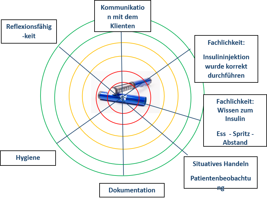 Praxisanleiter und Auszubildende analysieren gemeinsam eine reale Pflegesituation. Zum Beispiel: Ein Patient mit Diabetes benötigt eine Insulin-Injektion. Dabei sind nicht nur die technische Fertigkeit der Injektion gefragt, sondern auch Wissen über den Blutzuckerspiegel, die Beobachtung von Begleitsymptomen, die Kommunikation mit dem Patienten sowie hygienische und rechtliche Aspekte. - Strukturierung und Visualisierung der Kompetenzbereiche