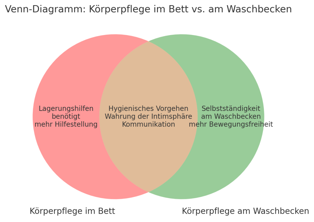 Die Venn-Diagramm-Methode ist ein grafisches Verfahren, bei dem Gemeinsamkeiten und Unterschiede zwischen zwei oder mehreren Handlungen, Situationen oder Konzepten sichtbar gemacht werden. Sie eignet sich in der praktischen Ausbildung besonders, um Pflegestandards auf unterschiedliche Bewohner:innen zu beziehen.